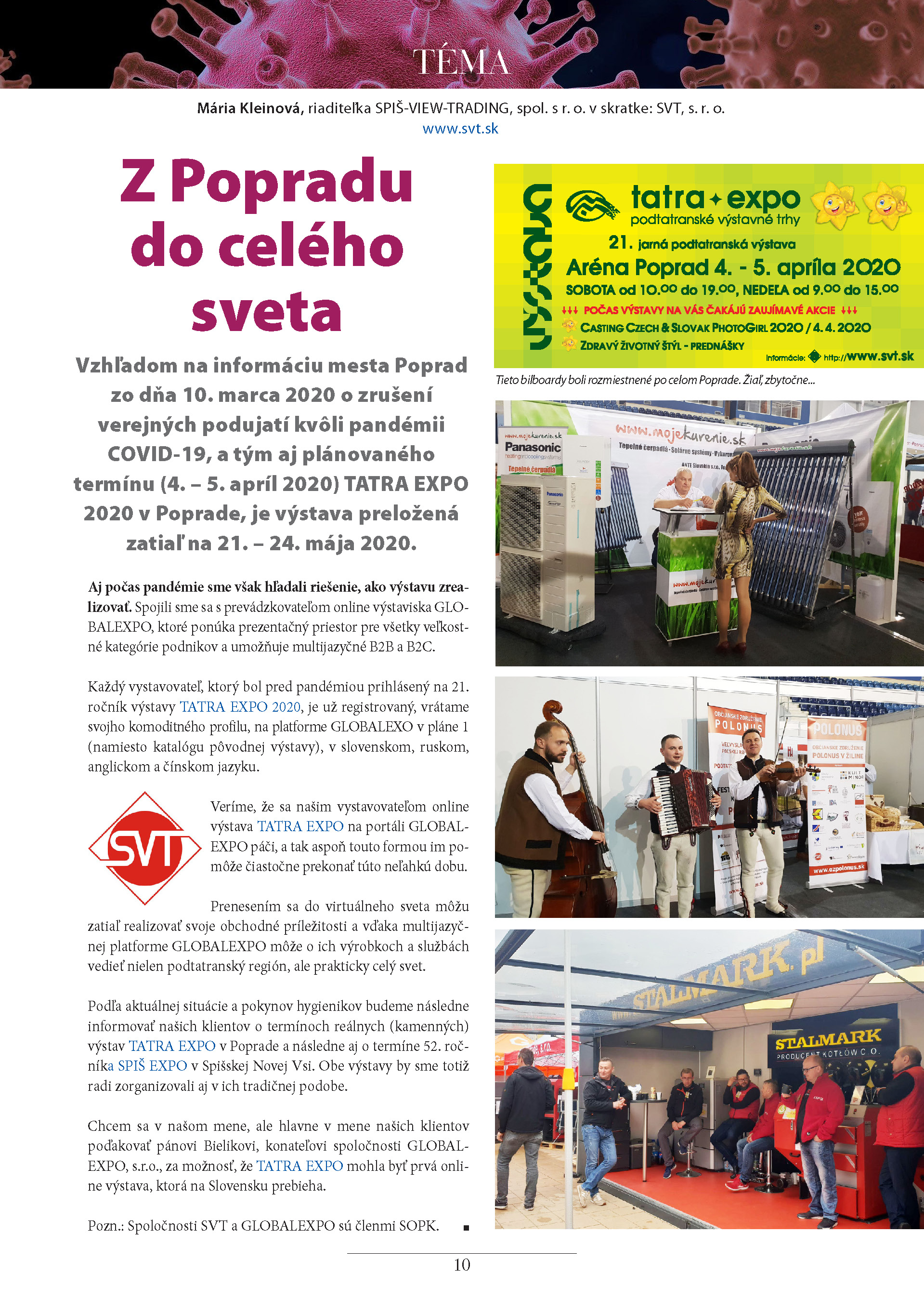 GLOBALEXPO umožnilo realizáciu tradičnej (kamennej) výstave s bohatou 21. ročnou históriou TATRA EXPO 2020 v online podobe. Viac sa dočítate aj v mesačníku OBCHOD PRIEMYSEL HOSPODÁRSTVO Slovenskej obchodnej a priemyselnej komory - partnera GLOBALEXPO. Odkaz na celé vydanie mesačníka OPH nájdete na stránka Slovenskej obchodnej a priemyselnej komory na tomto odkaze: